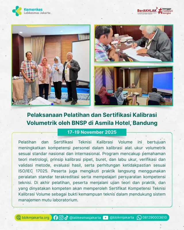 Pelaksanaan Pelatihan dan Sertifikasi Kalibrasi Volumetrik oleh BNSP di Asmila Hotel, Bandung (17β19 November).